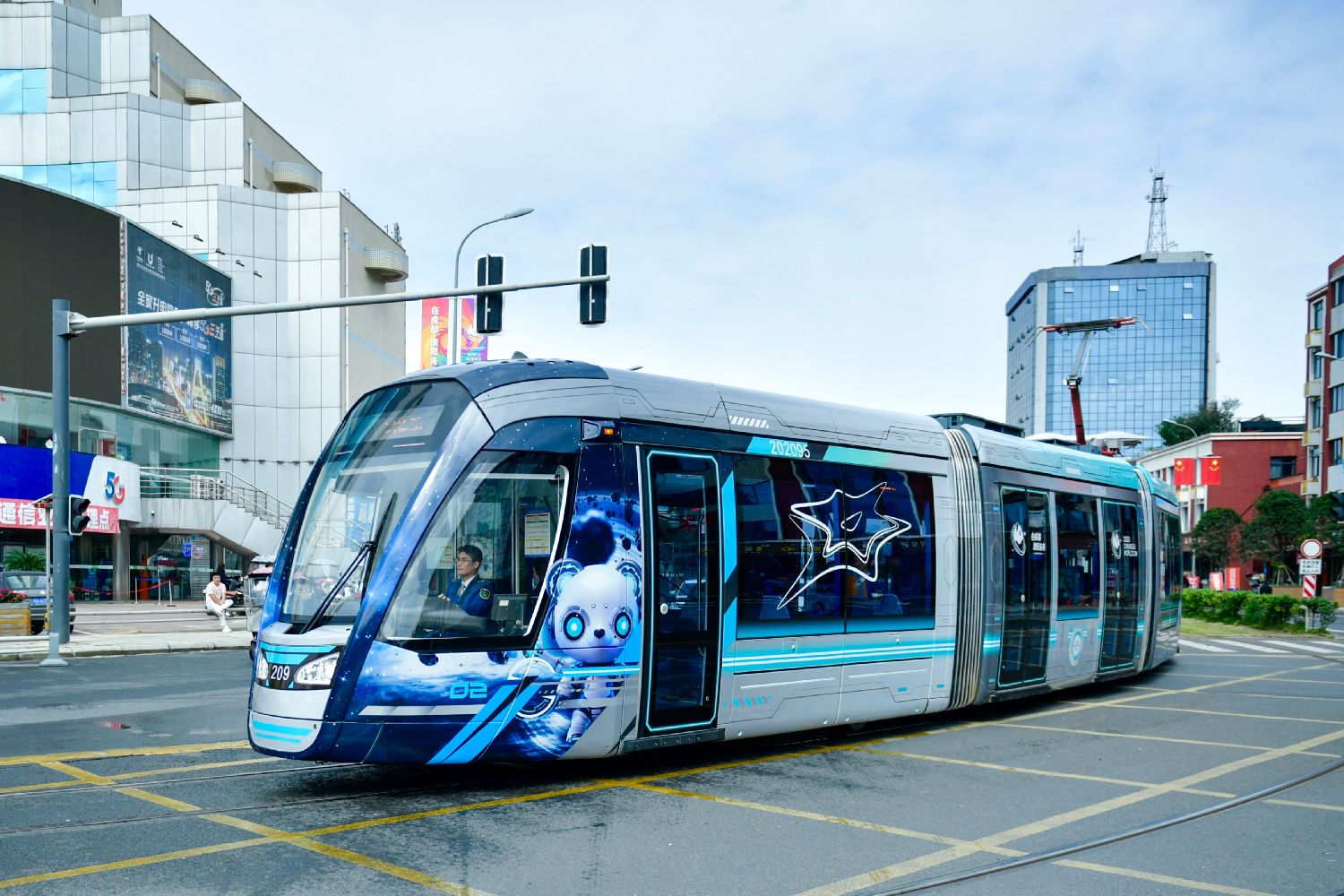 车身印有成都世界科幻大会吉祥物熊猫“科梦”的“蓉遇未来”主题列车在运行。(图片来源:本文图片均自中新社)