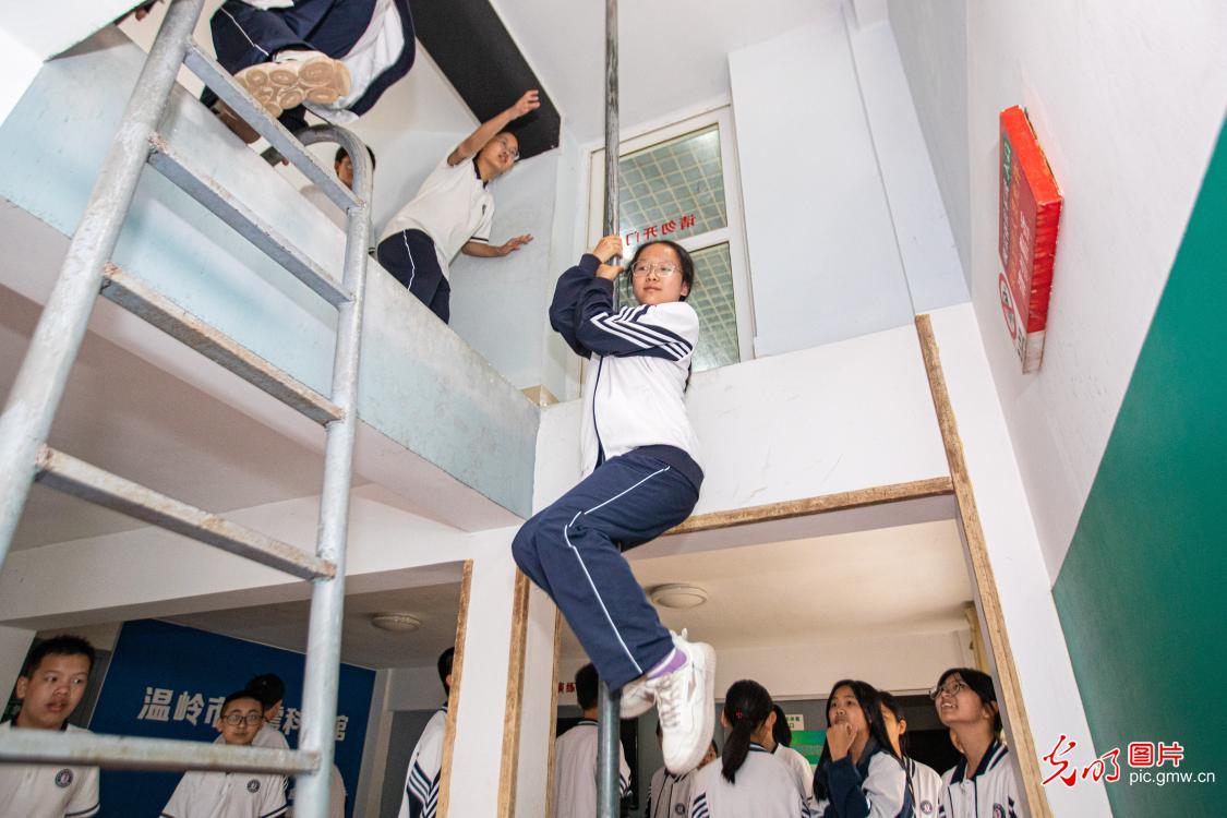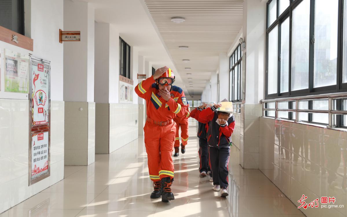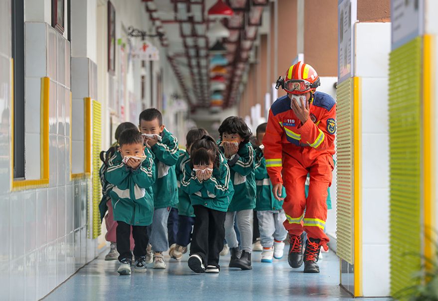10月13日,消防员在贵州省开阳县第二幼儿园带领孩子们模拟火灾现场紧急疏散。(图片来源:新华社)