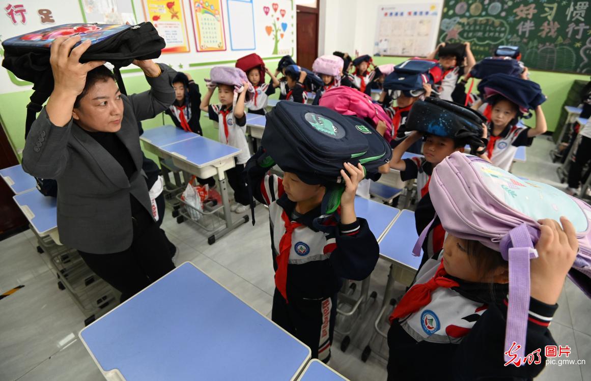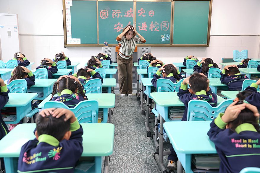 2023年10月13日,江苏无锡,无锡市滨河实验小学老师指导学生参加地震模拟演练。(图片来源:中新社)