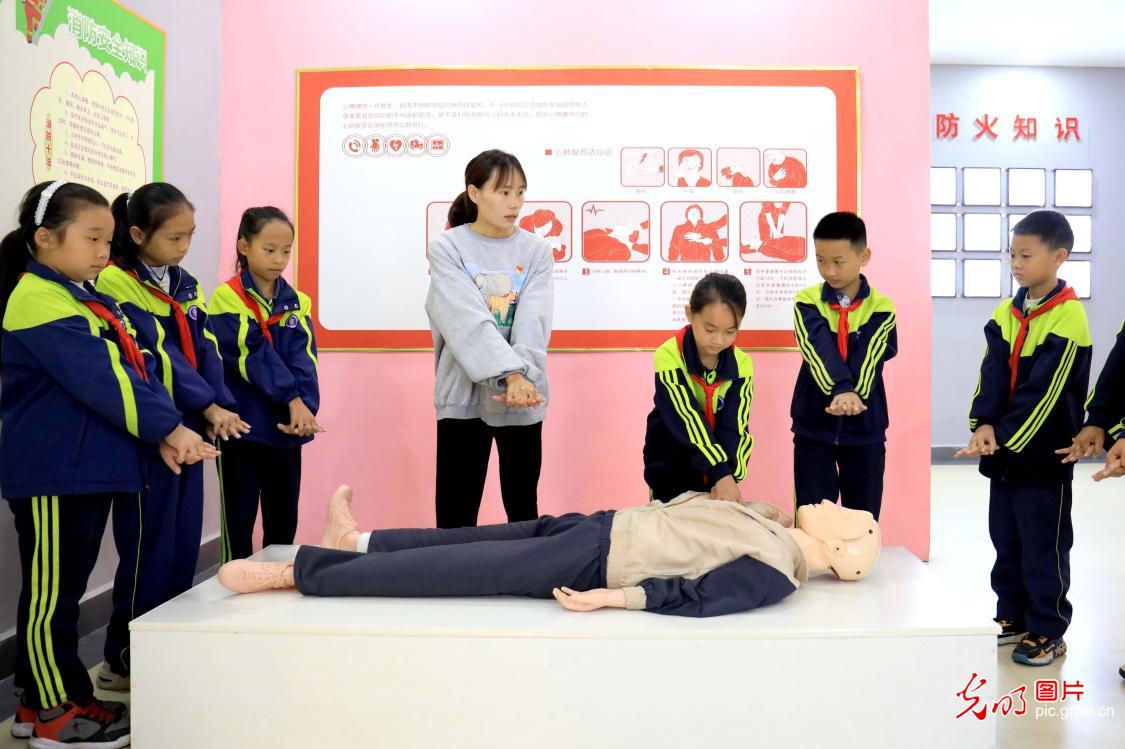 2023年10月13日,贵州省黔东南苗族侗族自治州岑巩县第三小学消防体验馆,老师在指导学生学习心肺复苏。