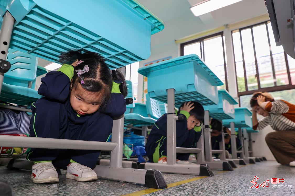 2023年10月13日,江苏无锡,无锡市滨河实验小学学生在参加地震模拟演练。