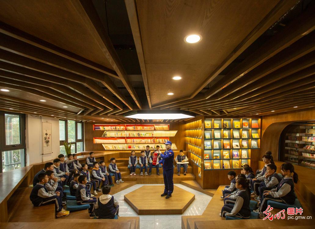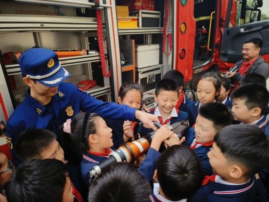 10月13日,在第34个国际减灾日到来之际,山东济南历下区开元山庄消防救援站的“蓝朋友”们走进文化东路小学,为3000余名师生送上一节生动的“消防安全教育课”。图为“蓝老师”带同学们参观消防救援车,让同学们近距离体验救援“百宝箱”的魅力。(图片来源:人民网)