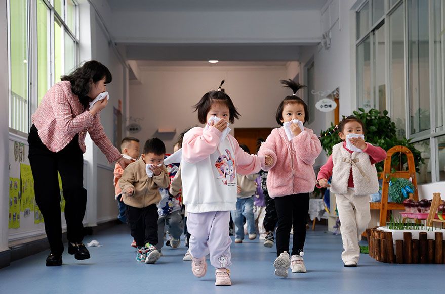 2023年10月13日,贵州省遵义市正安县机关幼儿园分园教师组织小朋友进行逃生演练。(图片来源:中新社)