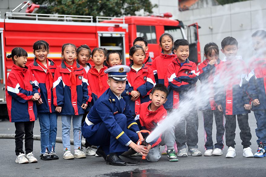 10月12日,在湖北省襄阳市保康县实验小学,学生在消防员的指导下体验消防水枪灭火。(图片来源:中新社)