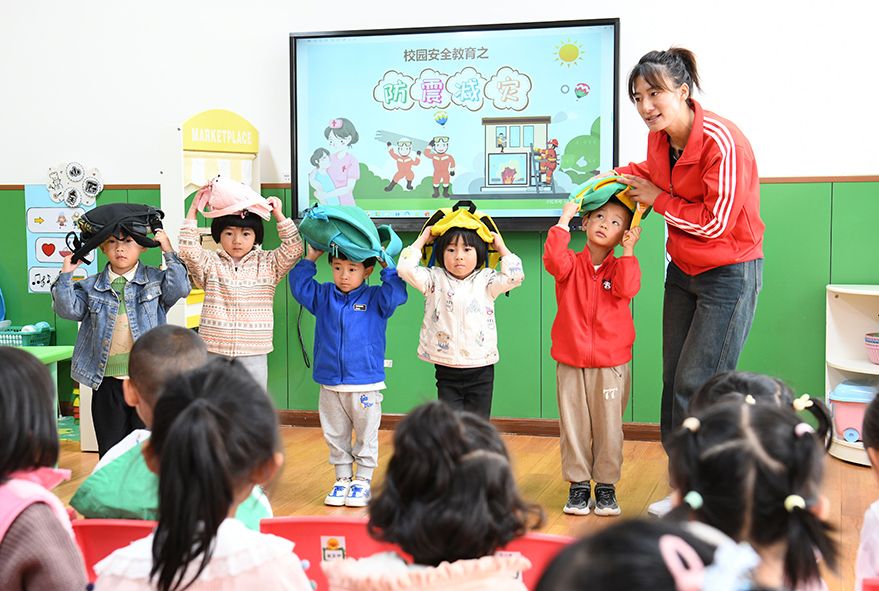 10月13日,云南省丽江师范高等专科学校附属新苗幼儿园的老师给孩子们讲解地震逃生和自救常识。(图片来源:新华社)