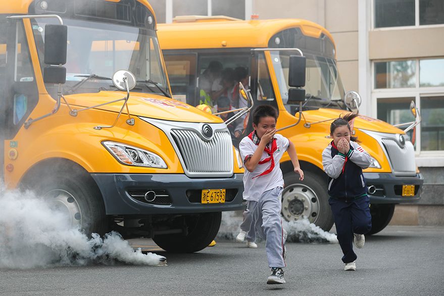 10月13日,浙江省湖州市德清县洛舍镇中心学校的学生在进行应急疏散演练。(图片来源:新华社)