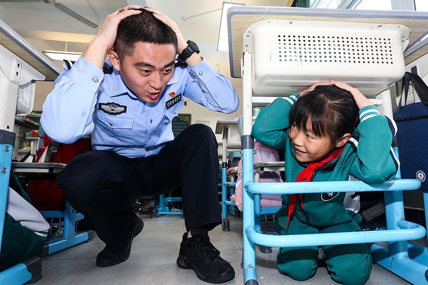 10月13日,浙江省舟山市岱山县公安局高亭派出所民警引导学生进行避险演练。(图片来源:新华社)