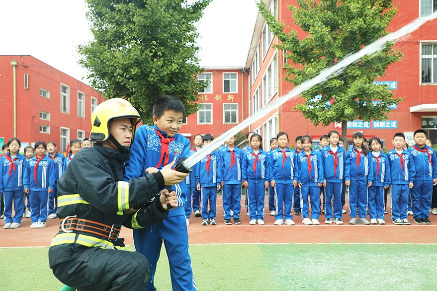 10月13日,河北省唐山市丰润区平安路小学的学生在消防员的指导下体验水枪。(图片来源:新华社)