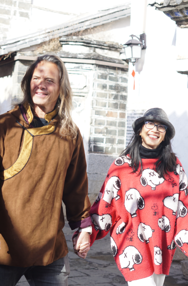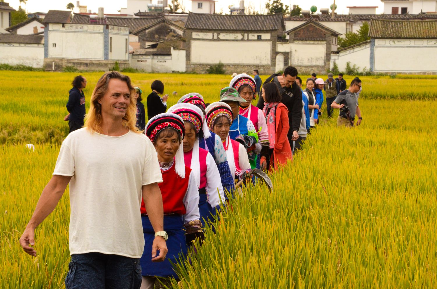 生活在喜洲古镇,林登喜欢和妻子手拉手,行走在云南大理喜洲镇稻田间。