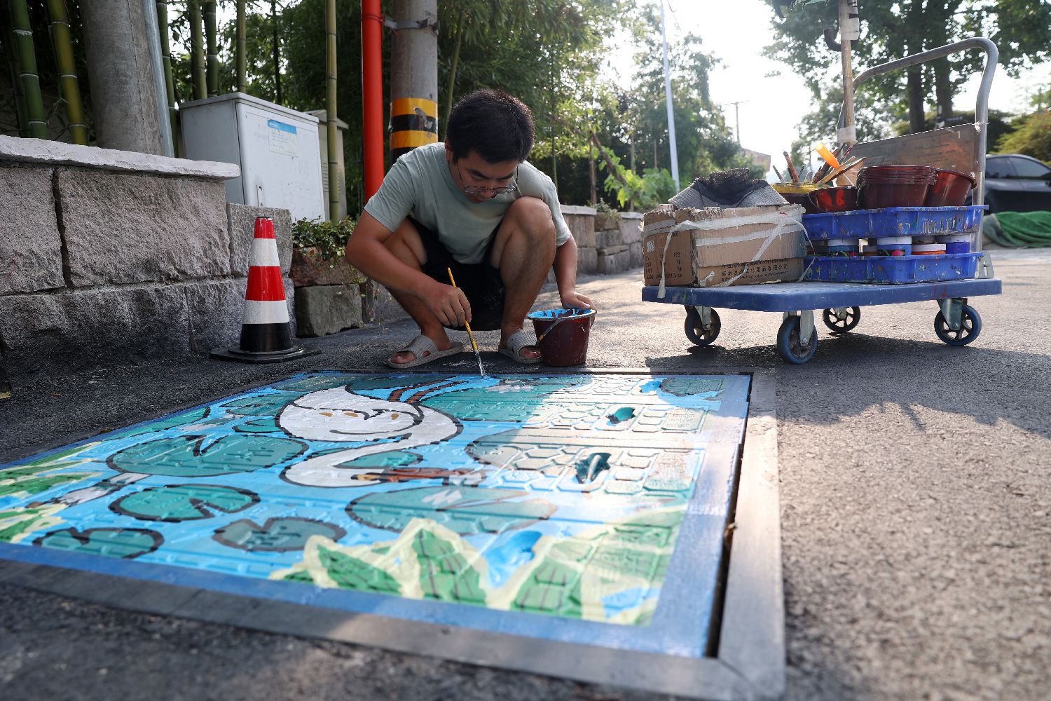 8月6日,陈喆的团队成员正在余村内进行井盖绘画。
