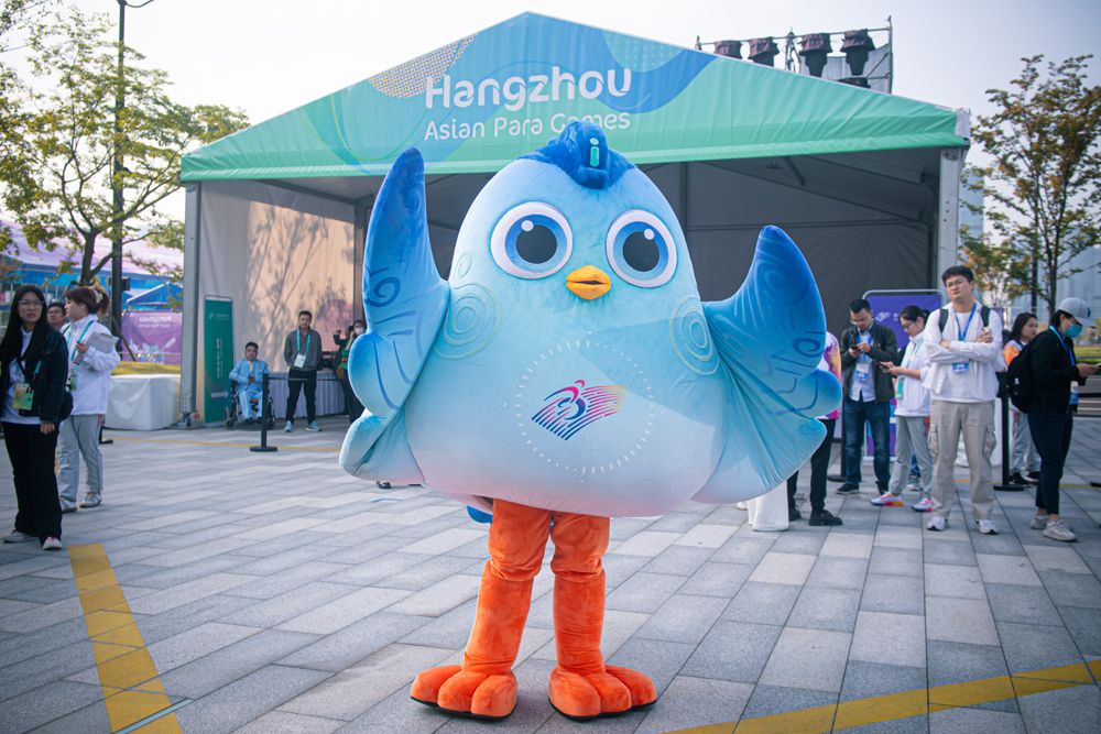 杭州亚残运会吉祥物“飞飞”在开村仪式上。(图片来源:新华社)