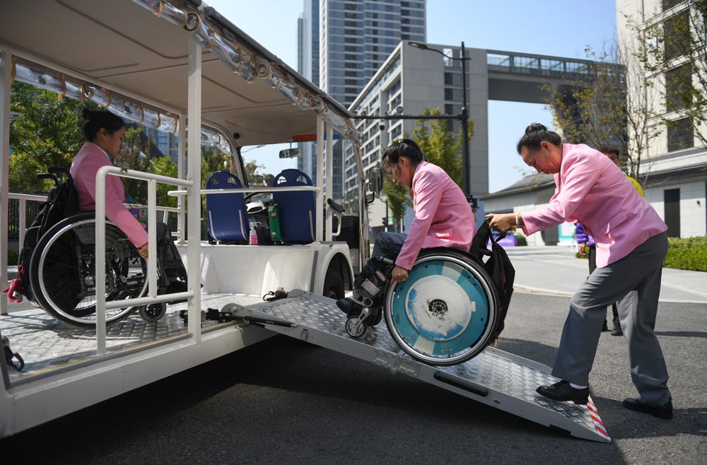 10月16日,运动员在亚残运村使用无障碍接驳车。