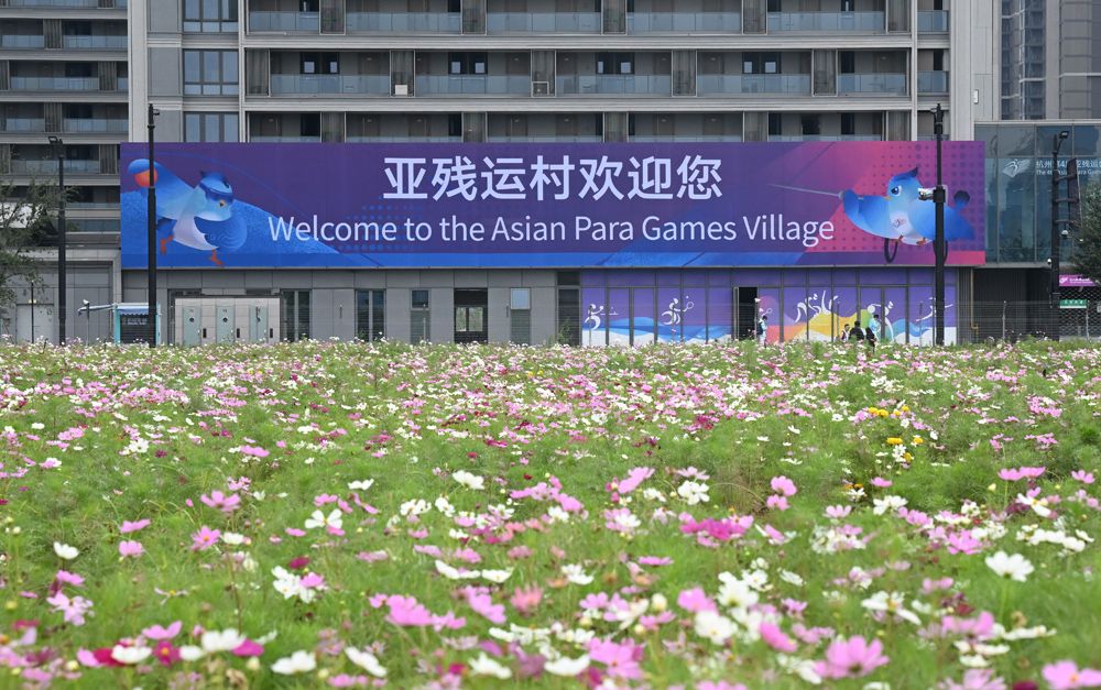 亚残运村由杭州亚运村媒体村转换而来,地上建筑面积72.2万平方米,赛时可为代表团提供3446套住宿房间,根据赛时运行划分为国际区、居住区和运行区。图为杭州亚残运村10月14日预开村,亚残运村外鲜花盛开。