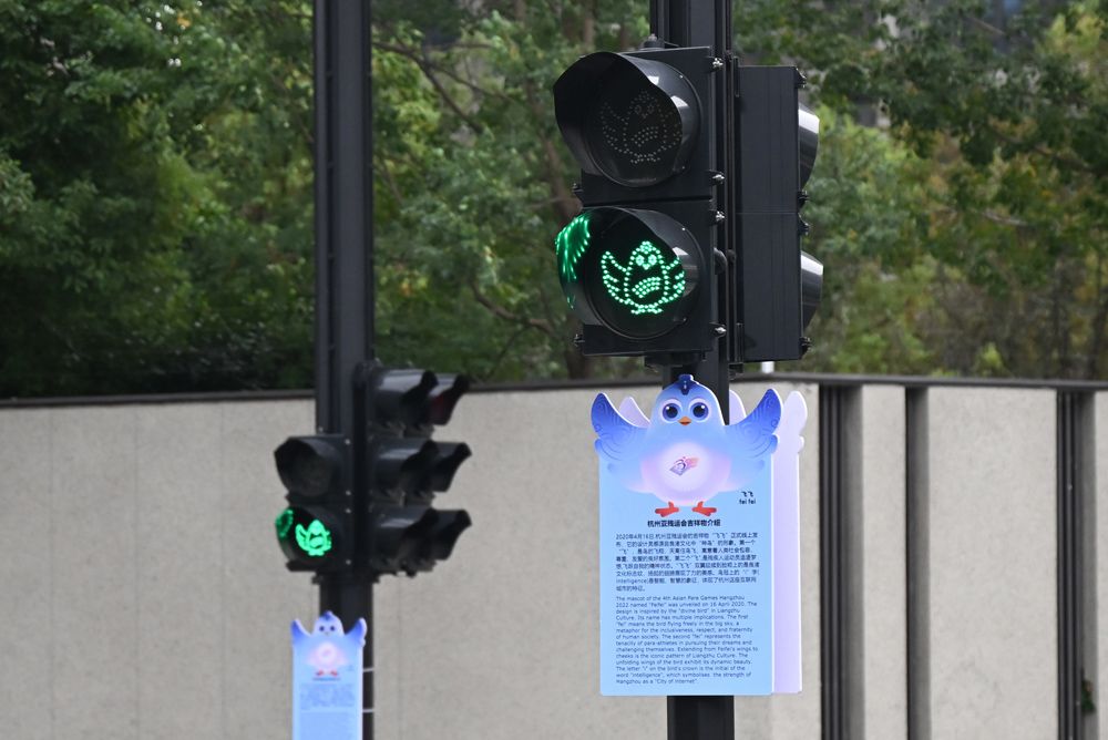 杭州亚残运村预开村,不少交通灯变换为杭州亚残运会吉祥物“飞飞”图案,成为一道别样街景。