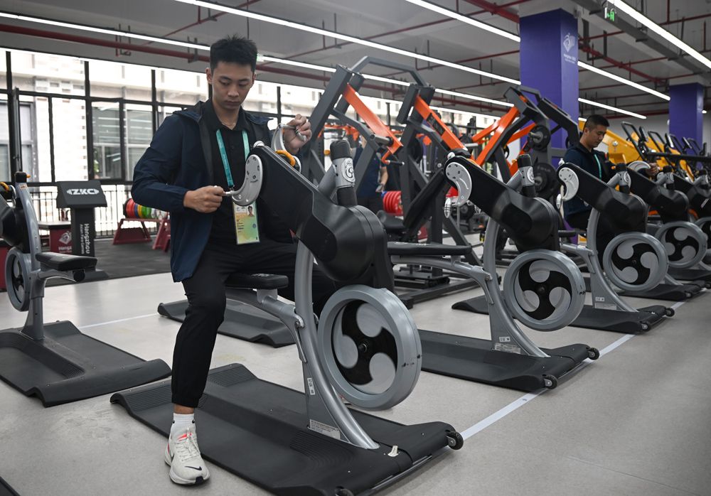 工作人员展示亚残运村健身中心内为残障人士配备的健身设施。
