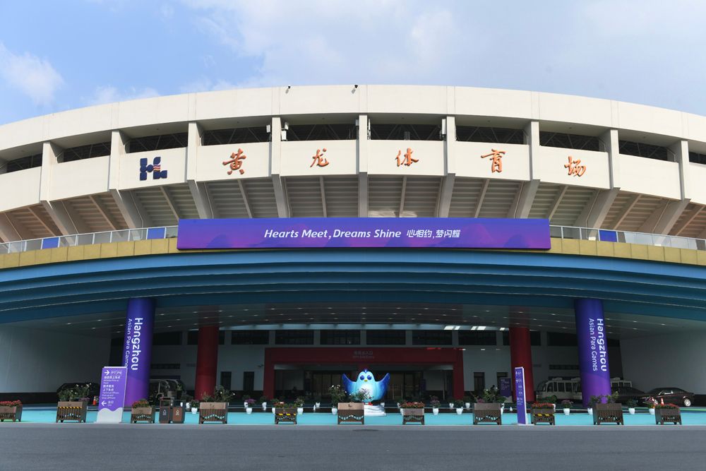 黄龙体育中心体育场外挂起杭州亚残运会口号。