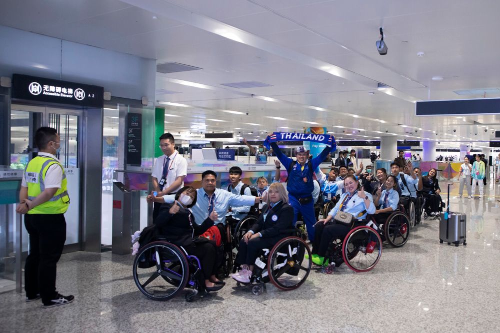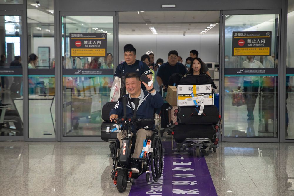 随着赛事临近,各国运动员也陆续抵达。图为10月16日,泰国代表团轮椅旅客排队乘坐无障碍电梯。当日,杭州亚残运会泰国代表团抵达杭州萧山国际机场。该代表团共有219名成员,其中包含78名轮椅旅客。