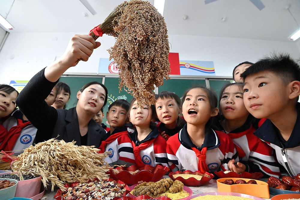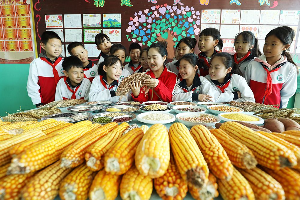 河北省邯郸市邯山区实验小学的学生在老师的指导下认识粮食作物。(图片来源:中新社)