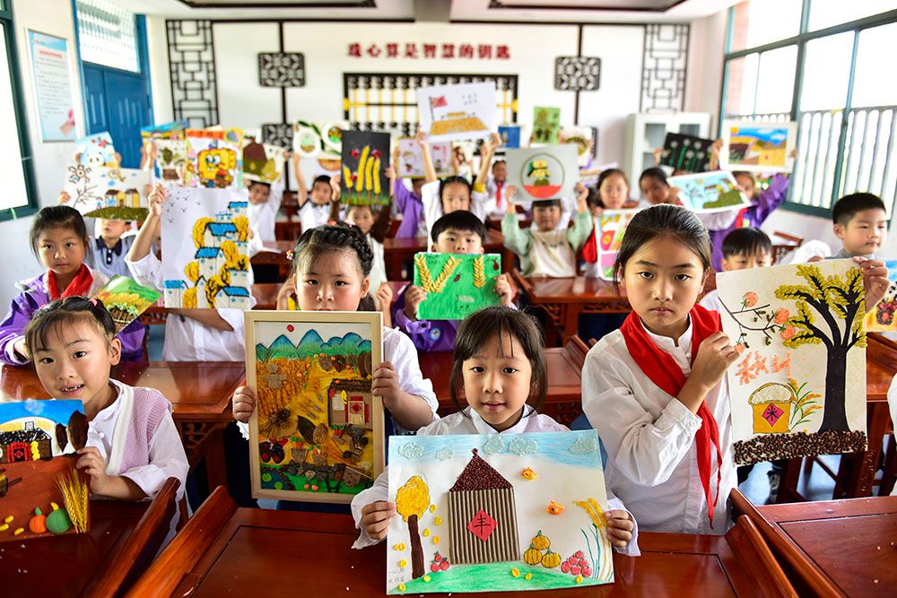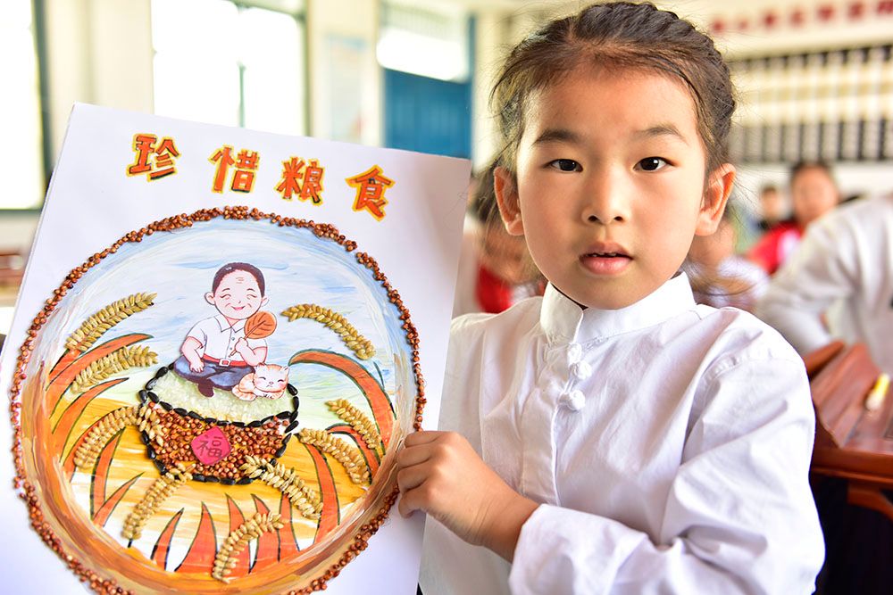 在安徽省合肥市十里庙小学,学生展示“粮食画”作品。(图片来源:中新社)