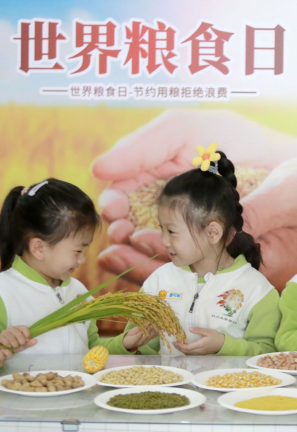 江苏扬州大学附属西郡幼儿园的孩子学习如何辨识粮食。(图片来源:新华社)