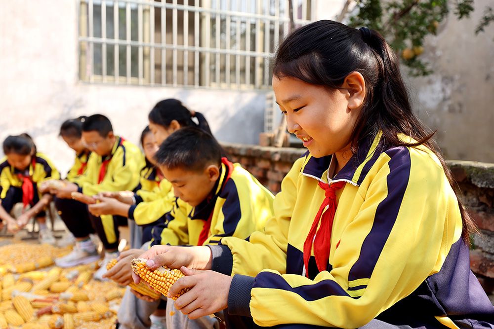 山东省枣庄市东山阴小学学生在农家小院帮农民搓玉米。(图片来源:新华社)