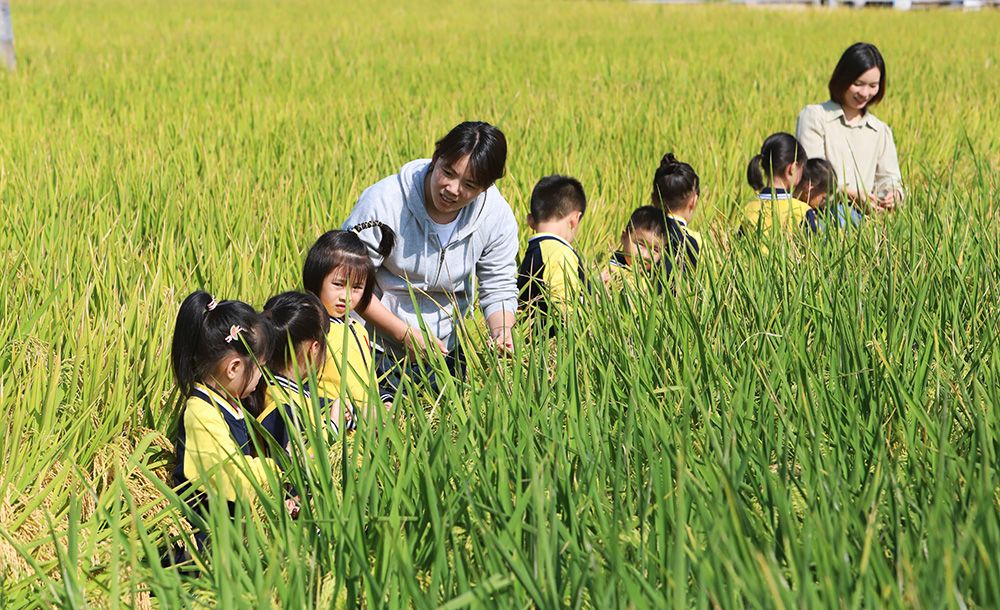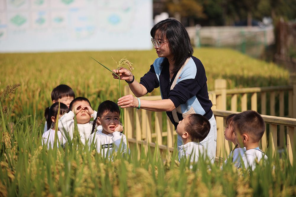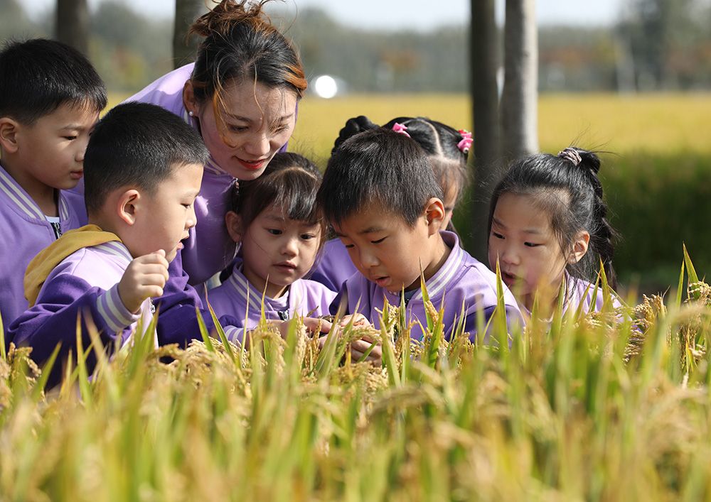 幼儿园的小朋友在老师的带领下走进田间,认识粮食。(图片来源:新华社)
