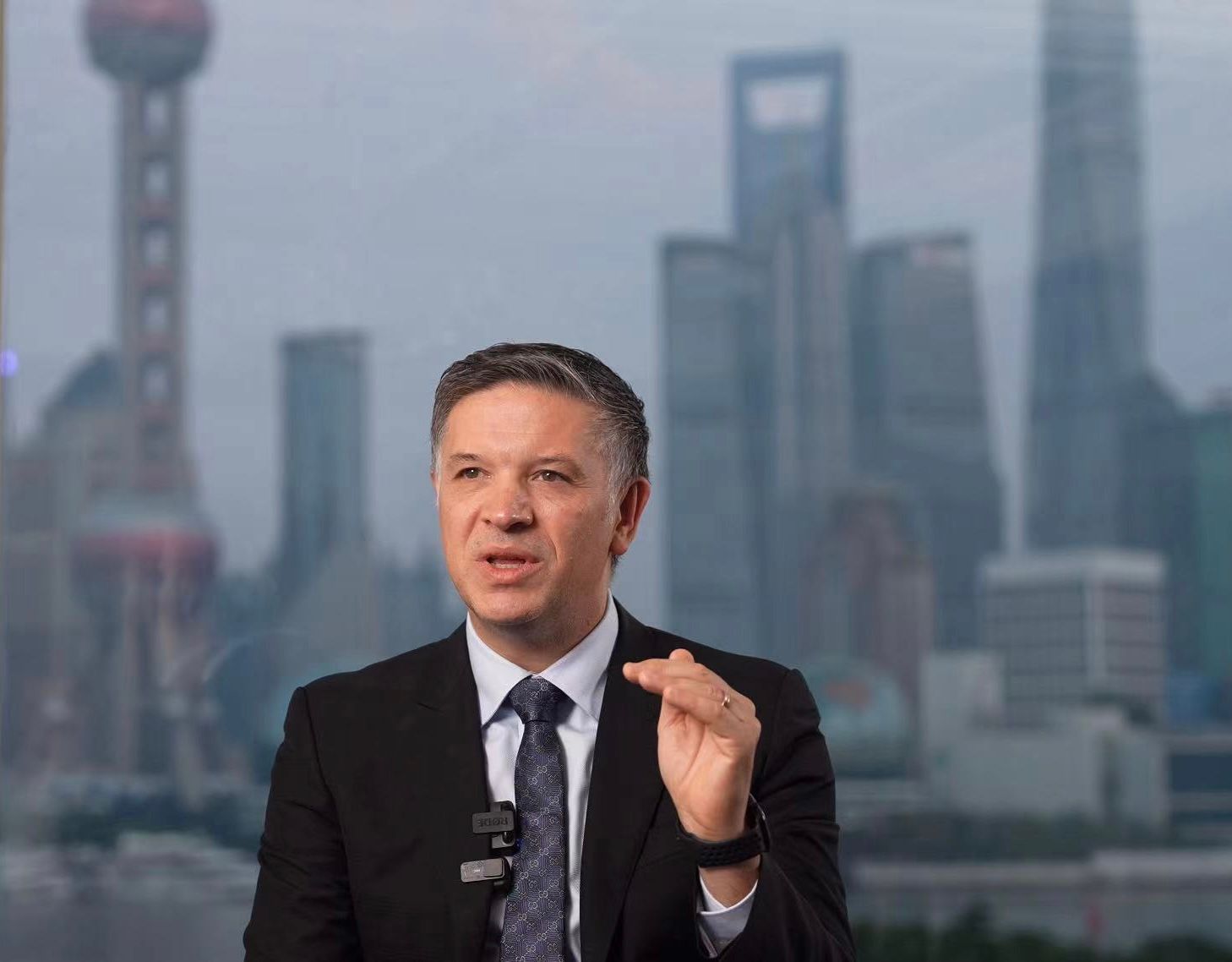 10月15日,百威集团全球首席执行官邓明潇在参加IBLAC期间,在上海接受媒体采访。(图片来源:百威集团供中新社图)
