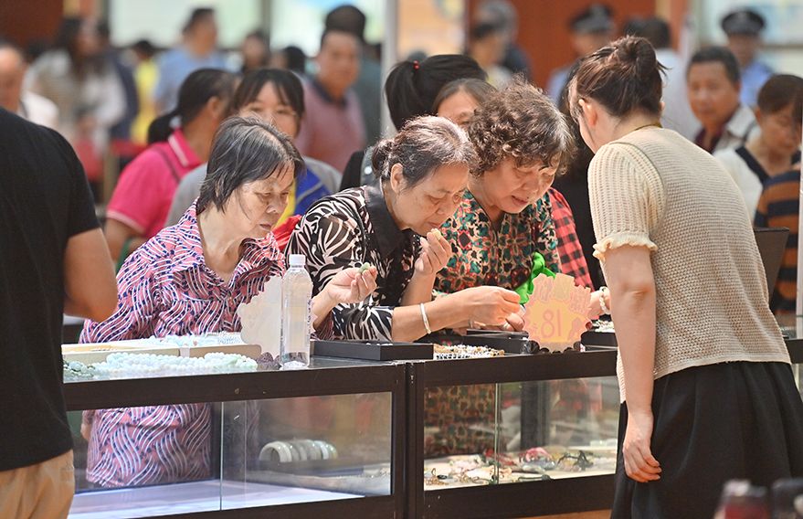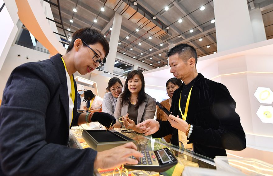 10月18日,观众在珠宝展上选购商品。