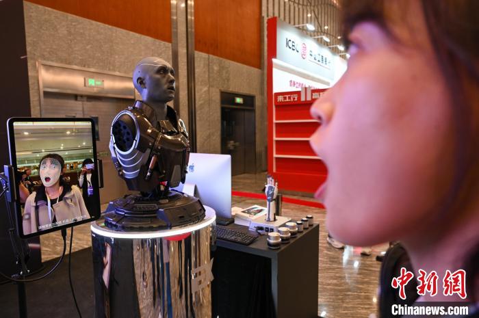 图为观众在工业互联网创新成果展上,与仿生机器人互动。(图片来源:中新网)