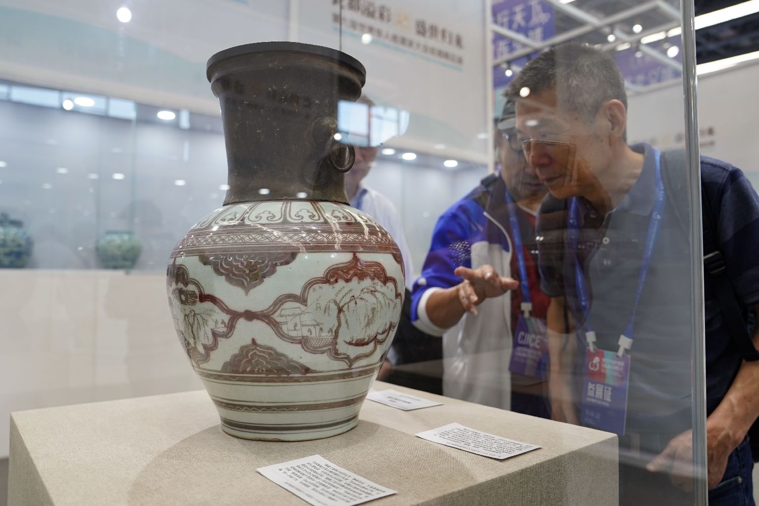 整个展陈分为会展中心和交易中心两部分,入驻交易中心的500多家商户今后将常态化运营,真正实现瓷博会“永不落幕”的目标,打造“买全球、卖全球”的标杆性陶瓷大市场。图为两名外国参观者在瓷博会上欣赏陶瓷艺术品。(图片来源:新华社)