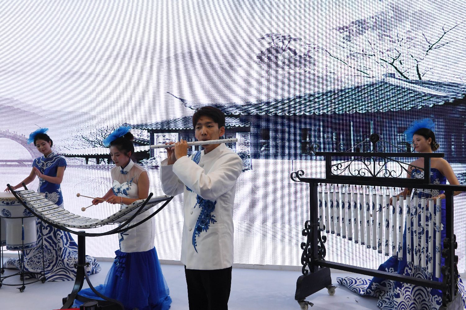 图为演员在瓷博会现场演奏陶瓷乐器。(图片来源:新华社)