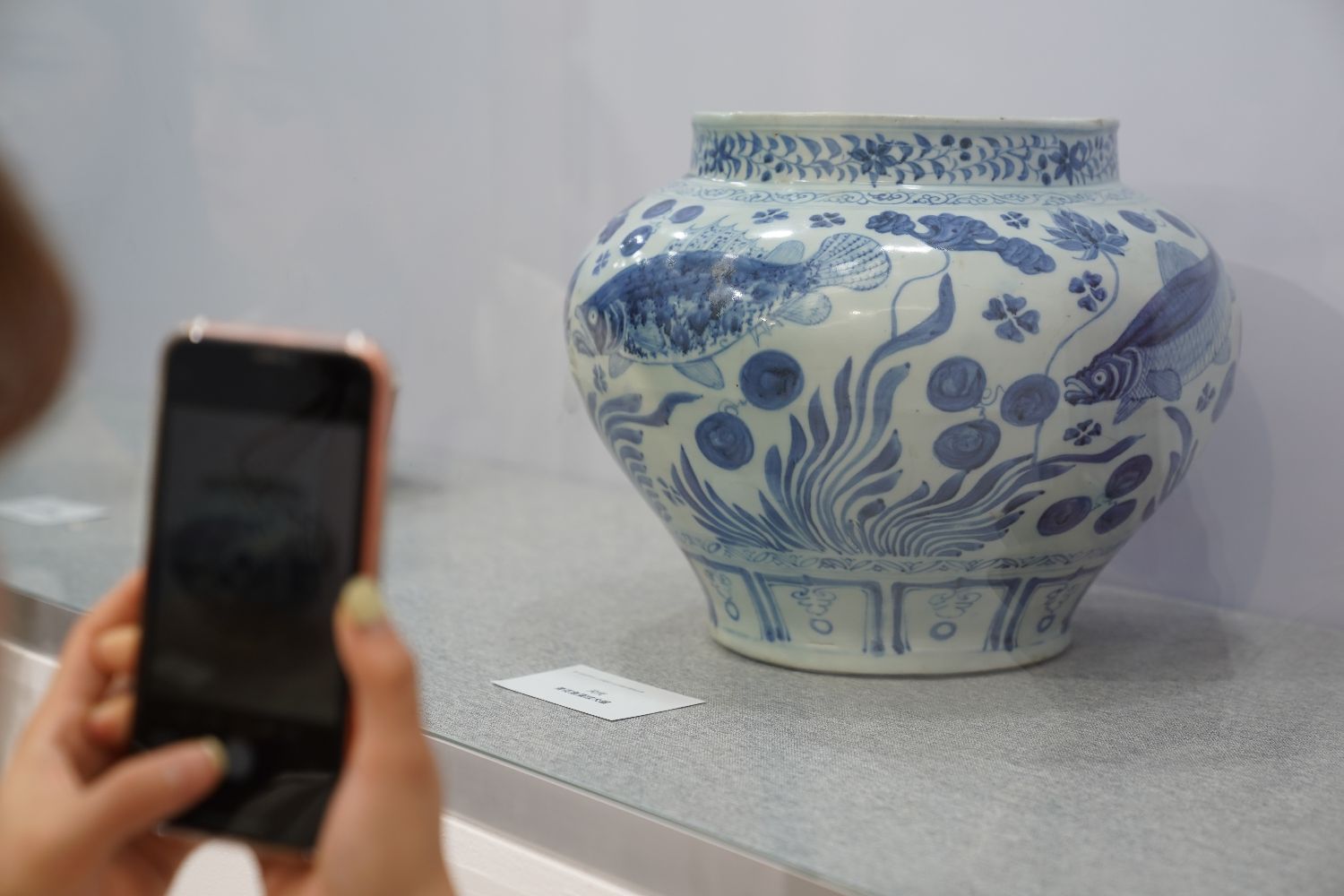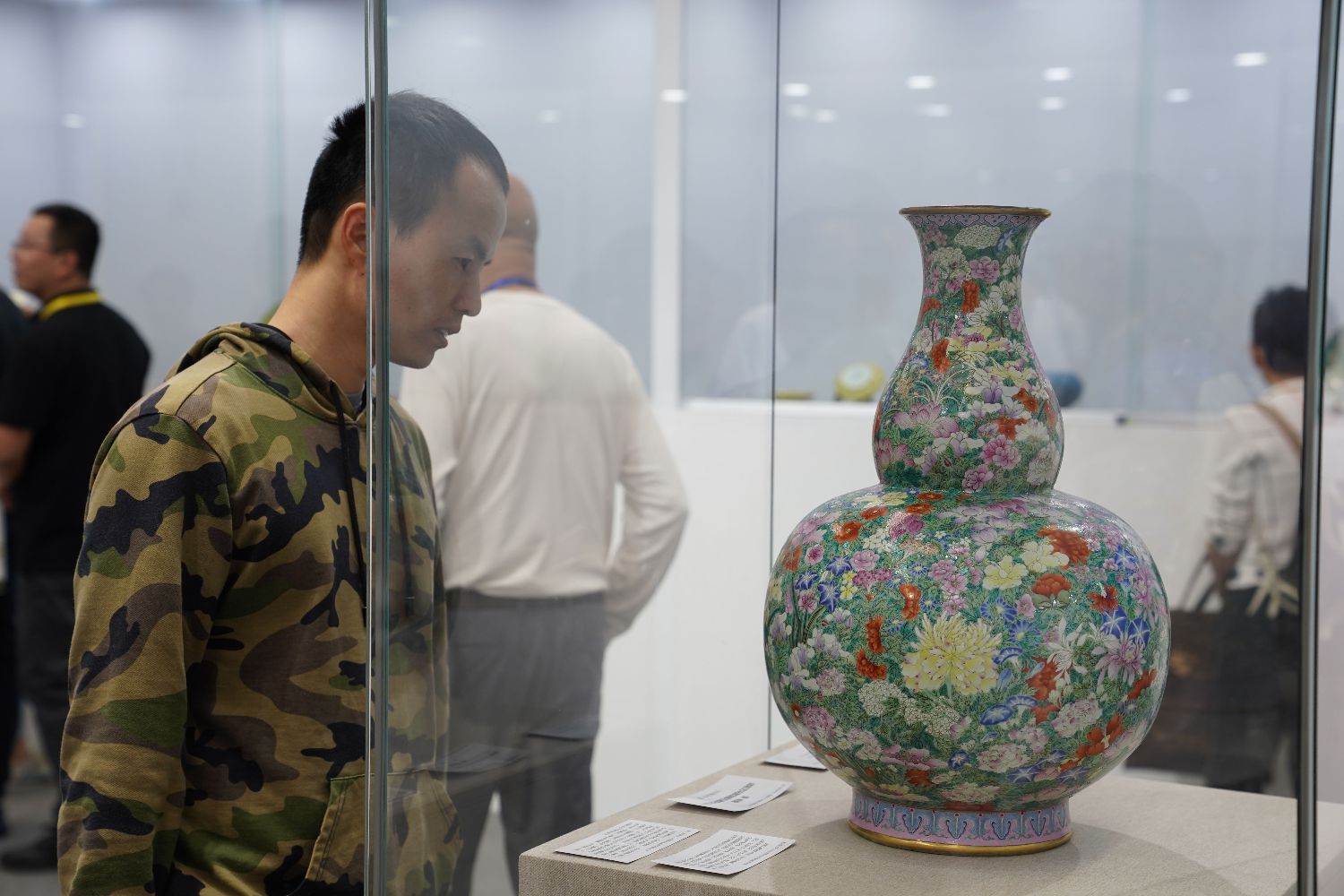 图为参观者在瓷博会现场举办的第六届世界华人收藏家大会瓷器精品展上拍摄展品。(图片来源:新华社)