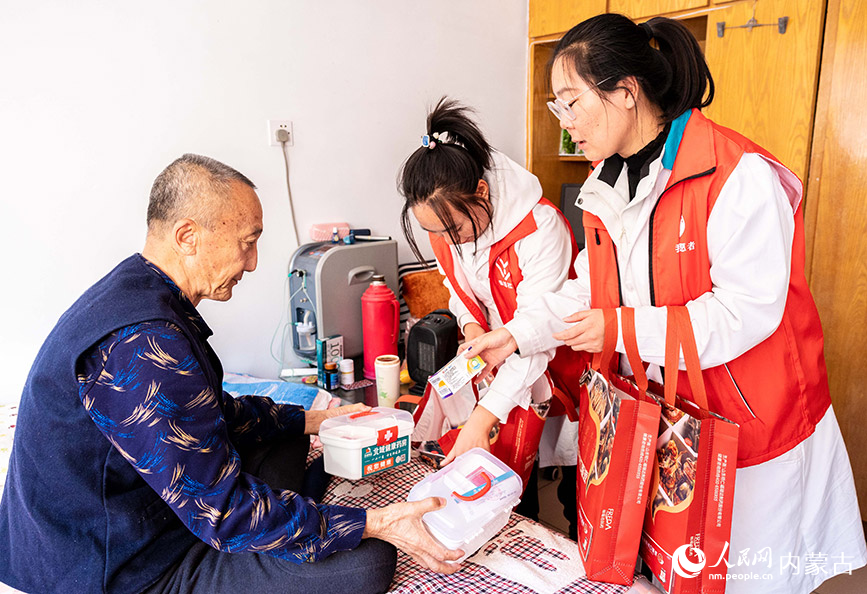 10月18日,内蒙古北域健康药房连锁有限公司的志愿者为菩提塔东社区患有慢性病的老人赠送“健康礼包”。(图片来源:人民网)