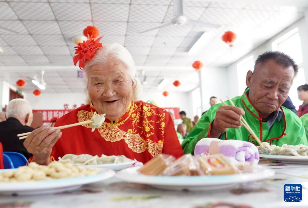 10月16日,在山东省滨州市惠民县胡集镇敬老院里,老人们在吃水饺,迎接重阳节。(图片来源:新华社)