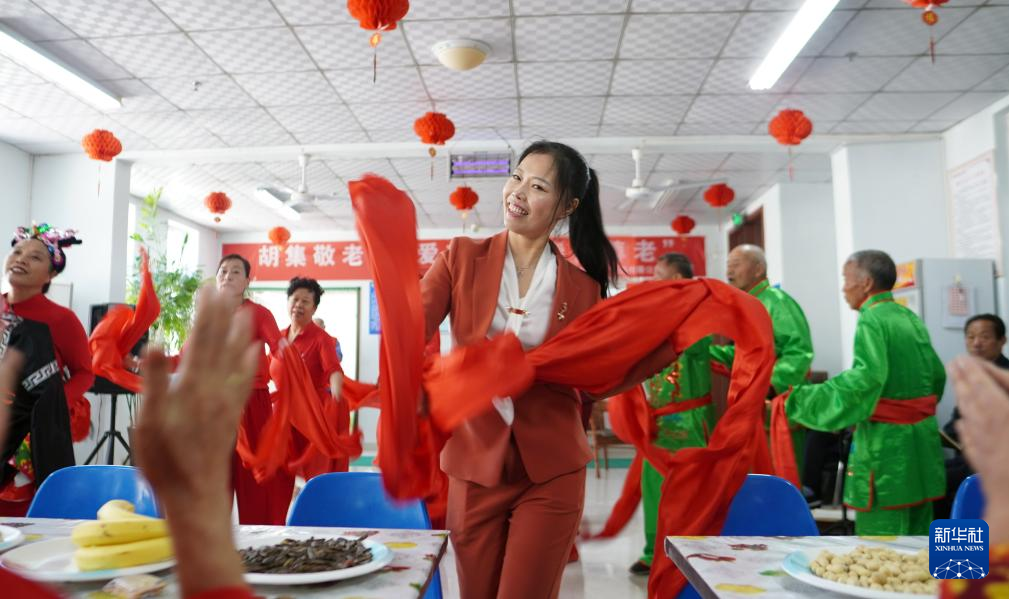 10月16日,在山东省滨州市惠民县胡集镇敬老院里,工作人员在为老人扭秧歌,迎接重阳节。(图片来源:新华社)