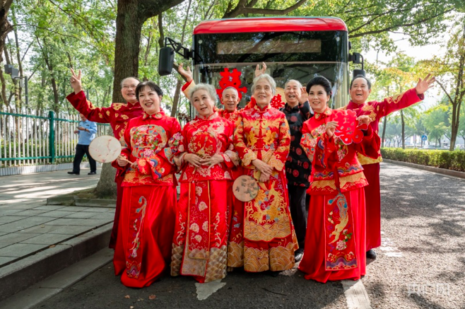 10月17日,宁波轨道交通、宁波公交集团联合潘火桥社区,在公交车厢以及地铁车站内为4对老人举办“爱在重阳 幸福之约”公益婚纱照摄影活动。图为4对老人拍婚纱照现场。(图片来源:北京央广网)