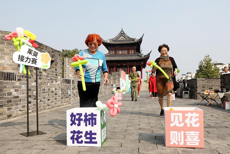 2023年10月19日,苏州市姑苏区金阊街道阊门社区组织辖区老年居民开展丰富多彩的趣味体验活动,共迎传统重阳节的到来。(图片来源:中新社)