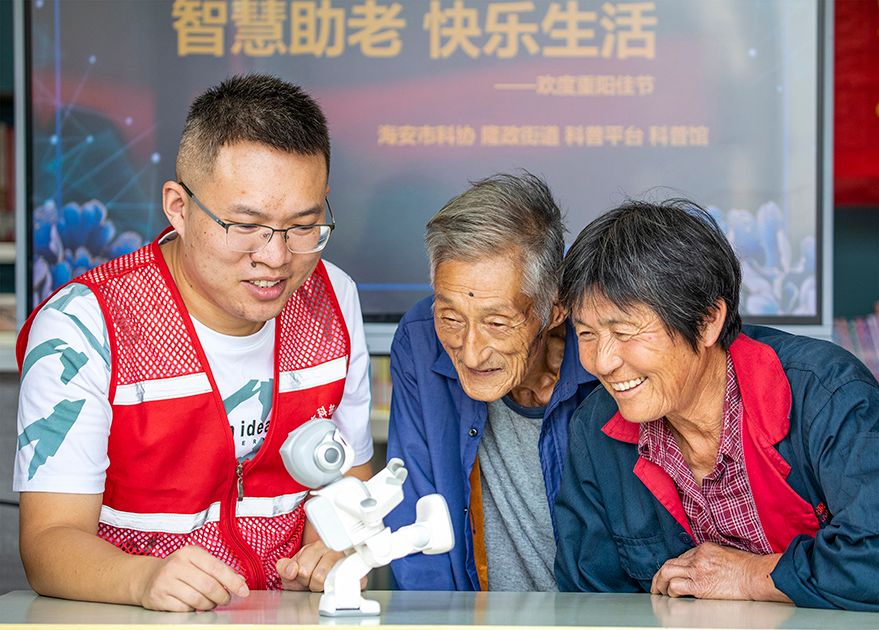 2023年10月19日,江苏省海安市隆政街道大里村农家书屋内,志愿者在指导老人们与智能机器人互动。江苏省海安市隆政街道联合海安市科技与科普服务平台在大里村举办“智享银龄 情暖重阳”活动,志愿者为村里老人们普及科技知识,引导广大老年人融入现代数字化生活。(图片来源:中新社)