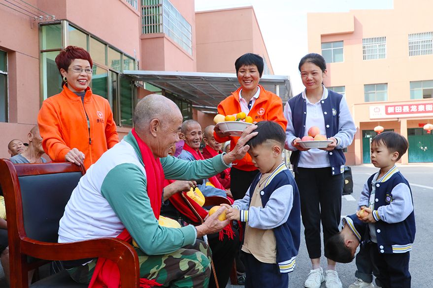 2023年10月18日,湖南省永州市新田县龙泉中心敬老院,孩子们在给老人戴上红围巾,送上暖手套和水果。在重阳节即将来临之际,新田县爱善幼儿园开展“童心敬老,情暖重阳”主题教育活动,带领孩子们来到新田县龙泉中心养老院,和老人们一起演节目、做游戏,给老人们送礼物、敬水果等,用他们自己的方式表达对老人们的关心和祝福。(图片来源:中新社)