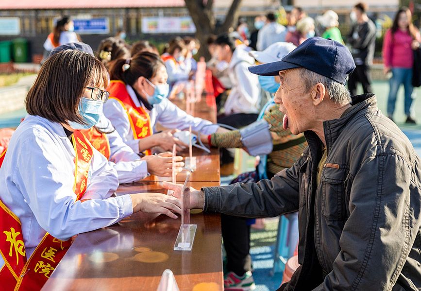 10月18日,内蒙古自治区人民医院第三党总支的医疗专家为社区老人把脉诊疗。(图片来源:人民网)