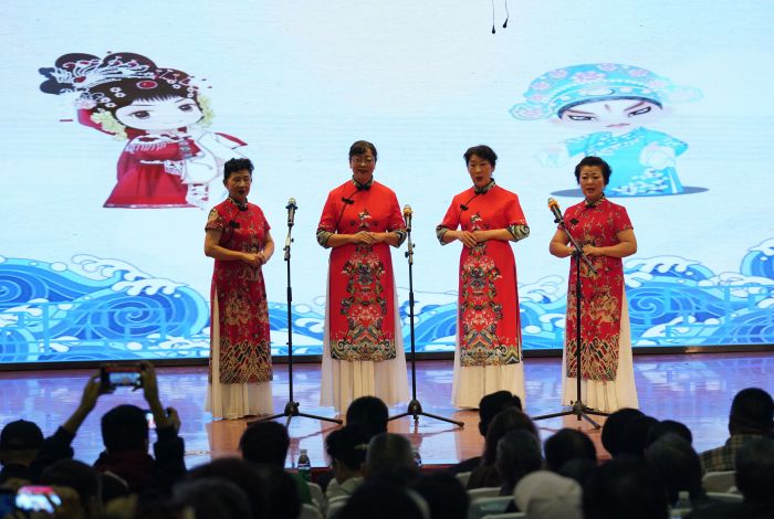 10月16日,新疆开放大学文汇楼礼堂,2023年乌鲁木齐市天山区退休人员共度重阳节戏曲、舞蹈汇演在此进行,300多名老年居民代表欢庆自己的节日。(图片来源:《中国日报》)