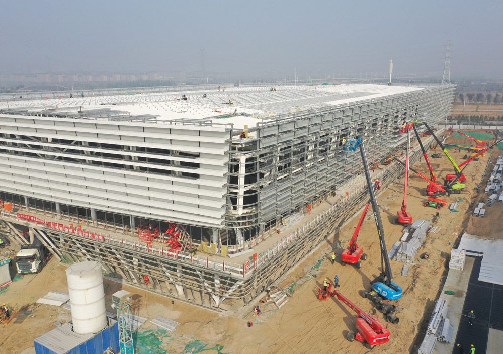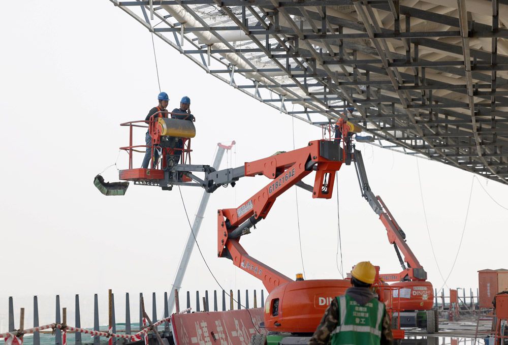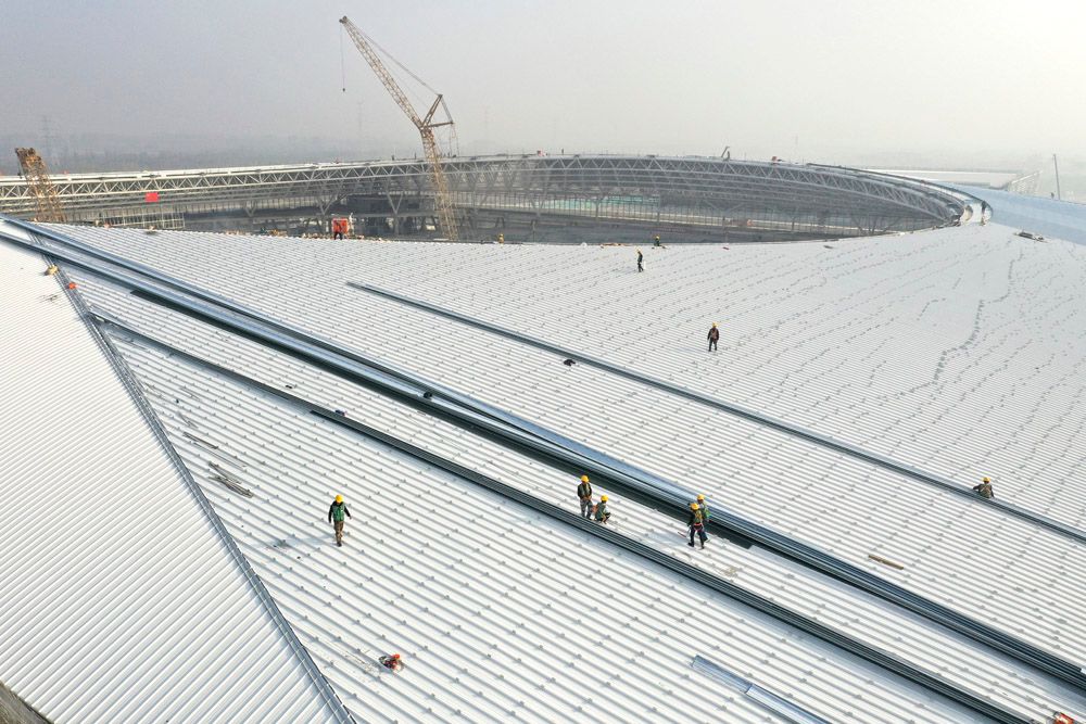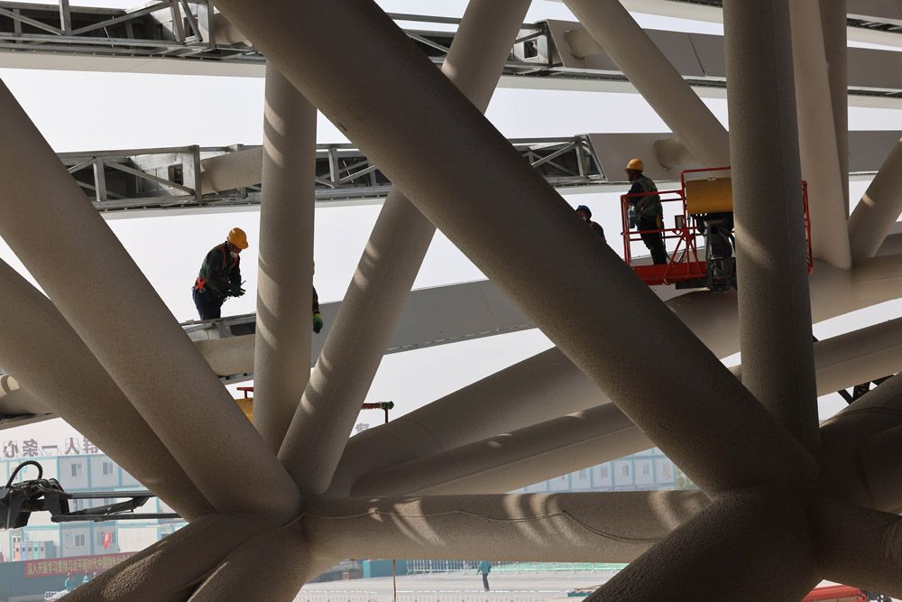 雄安体育中心是雄安新区启动区标志性建筑之一,建成后将能够满足承办国际单项赛事与国内综合赛事要求,也是未来雄安新区重要的体育活动配套建筑群。图为工人在雄安体育中心体育场施工。