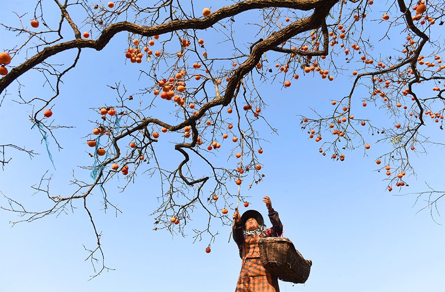 10月24日,山东省淄博市沂源县石桥镇分水新村的农民在采收柿子。(图片来源:本文图片均自新华社)