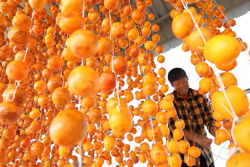 10月22日,村民在山东省枣庄市山亭区北庄镇双山涧村晾晒柿子。