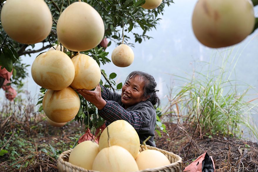 10月26日,村民在贵州省开阳县花梨镇清江村蜜柚种植基地里采摘柚子。