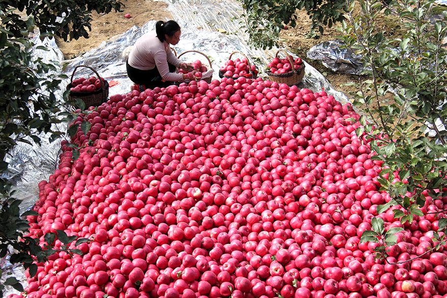 10月24日,在甘肃省平凉市静宁县余湾乡王坪村村民分拣苹果。