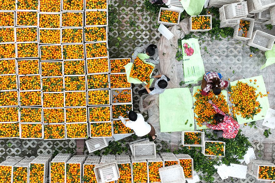 10月24日,四川省广安市武胜县龙女镇青岩村果农在挑选砂糖桔装框(无人机照片)。