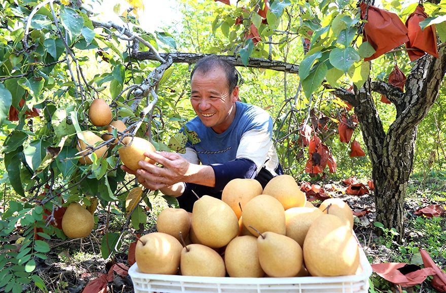 10月14日,河南省洛阳市汝阳县刘店镇二郎村雪梨种植大户袁小学采摘雪梨。