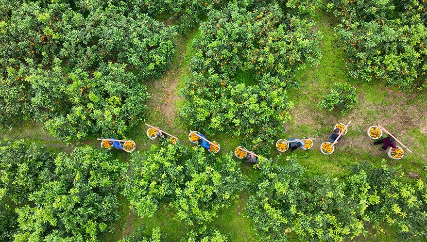10月24日,四川省成都市双流区永安镇梨园村柑橘种植基地工作人员在装运成熟的柑橘(无人机照片)。