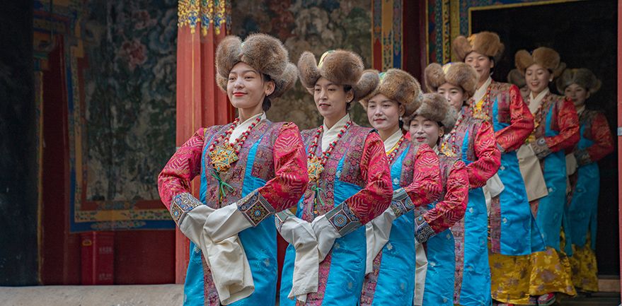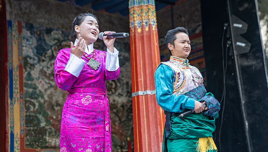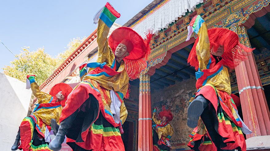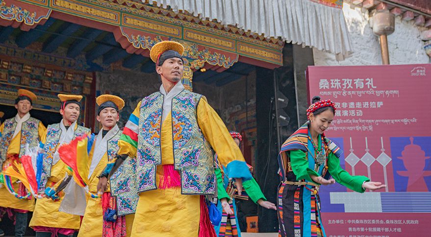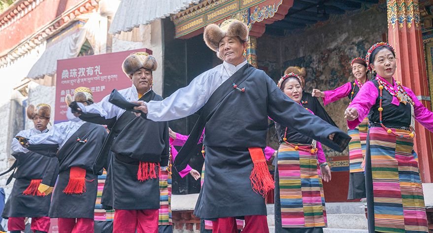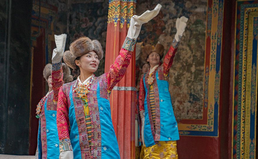 谐钦演员们精湛的表演技艺、华丽的戏服,将古老的西藏歌舞艺术完美呈现在这座古建筑前。